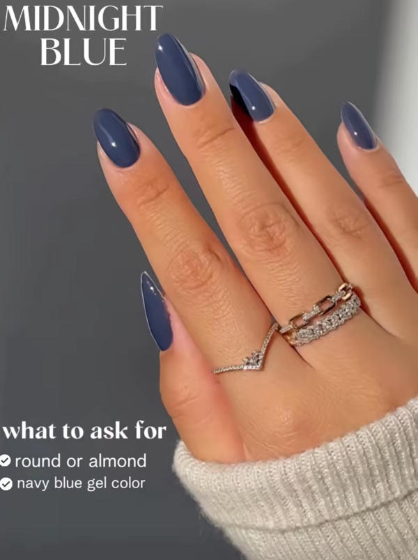 If you want something striking but slightly different, midnight blue is the way to go. This rich navy tone feels polished yet edgy, making it a great alternative to black. Ask for a rounded or almond shape, apply a dark navy shade, and finish with a glossy top coat for a sleek look.