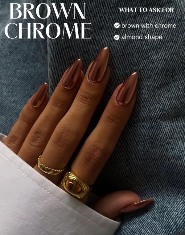 Nothing says fall quite like a deep brown with a glossy twist. Brown chrome nails bring warmth, elegance, and a hint of boldness all in one. Opt for an almond shape, coat it in a rich brown shade, and finish with a chrome powder to get that perfect reflective glow.